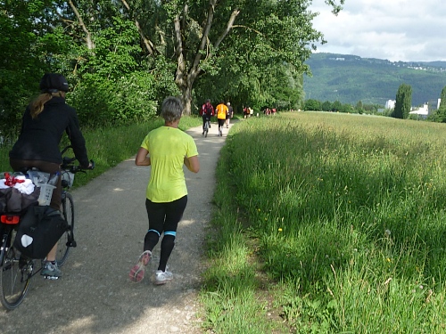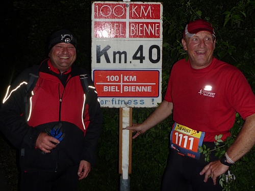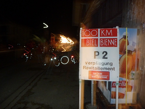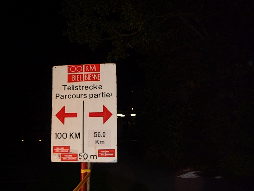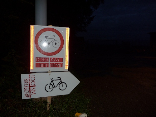 Bis hinter Lyss passe ich mich langssam den Fahrradfahrern an. Voll ausgerüstet wie Hochgebirgskämpfer nerven die mich vor allem durch ihr dauerndes Hin-und Her der Scheinwerfer. Selbst bei Steigungen müssen die neben ihrem Schützling fahren und besetzen mit ihrem Gewackel die gesamte Breite der Laufstrecke. Aber Biel ist Tradition und das ist das Schöne an der Alten, der 54 Jährigen.