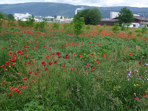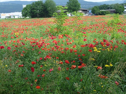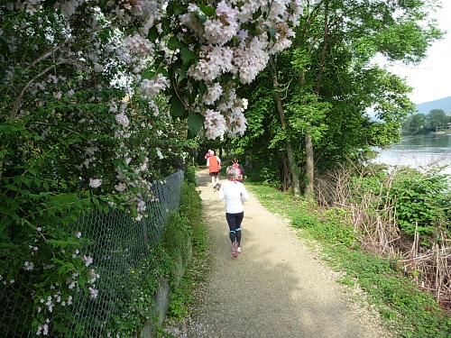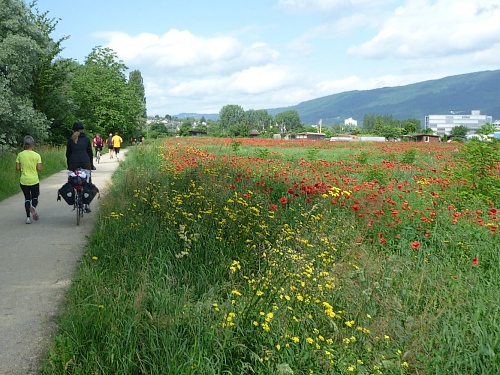 Wir wechseln die Uferseite, kommen auf die unangenehme Seite, denn hier fällt der Weg nach links ab, sodass meine unoperierte Ferse jaulen muss. Ich wäre ja schon längst den Transeuropalauf gelaufen, aber die linken Seite gefällt mir nicht. Ich bin Rechtsläufer, dafür müsste ich nochmal unters Messer. Doch das Mohnfeld ist der Hit, da könnte man ja mal wieder mittig durch.