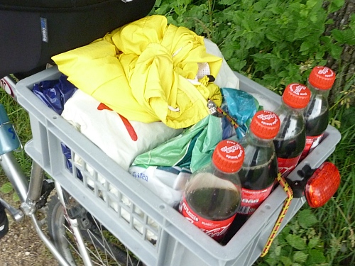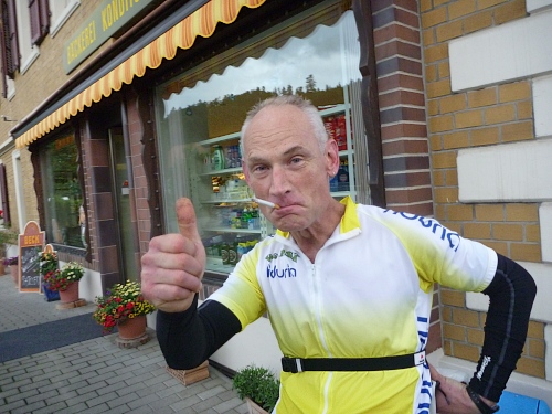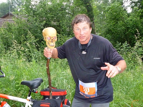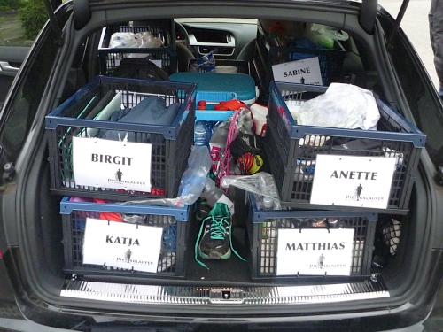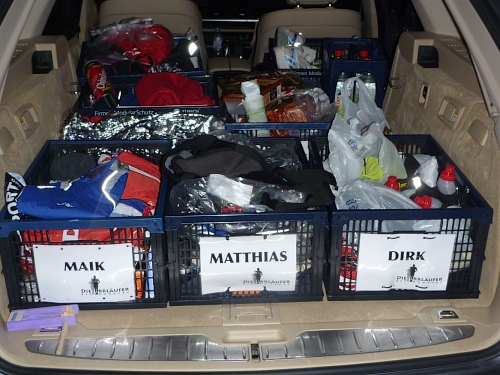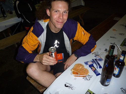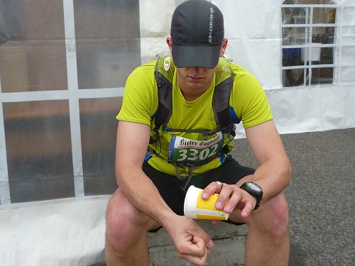 Dann verschnüre ich meinen Notfallbeutel und schicke ihn zurück zum Ziel. Er wird vor mir da sein, mitsamt den Bierdosen. Mir scheint es nicht gut zu gehen. Anderen geht es schlechter, schlafen eine Runde, lassen sich massieren oder sitzen schon im Bus zurück zum Start. Peer futtert eine herzchenförmige kalte Nudelmahlzeit aus eigenem Bestand. Da wird mir wieder schlecht. Zum Glück entdecke ich meinen Kumpel Jürgen vom CBXR, abwohl der aussieht wie die Nudelmahlzeit vom Peer und mich genauso herzlich begrüßt.