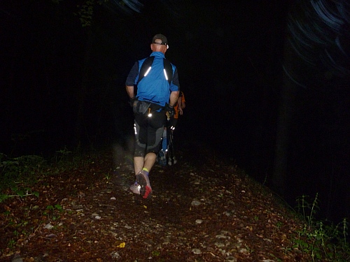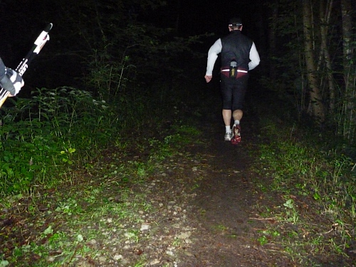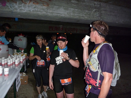 Grelles Licht kündigt Kirchberg, km 56 an. Ich entdecke Hartmann aus Südtirol, dann Wendy. Das erste Mal meiner Nächte der Nacht, oder Macht der Mächte muss ich wechseln, meine Klamotten. War die Nacht letztes Jahr klatschnass, so haben wir heute eine kalte Schwüle, die nichts trocken lässt. Ich ziehe mich um, trinke Kaffee und Apfelschorle. Diese Nacht der Nächte ist anders. Sicherheitsnadeln werden bei geschwollenen Fingern auf neuem Hemd zum verbogenen Sicherheitsrisiko. Hätte ich gewusst wie unsicher deformierte Sicherheitsnadeln sind... doch glücklicherweise merkt man erst unter der Dusche, wo man überall wund ist.