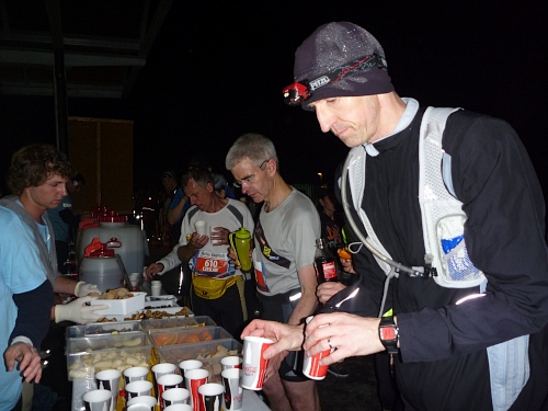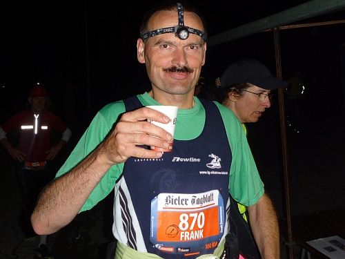 Km 80 - Arch in Sicht. Hinter der Verpflegungsstation im Bierzelt gröhlen übernächtigte Zaungäste schmutzige Lieder. Wo man singt, da lass dich nieder. Also schaue ich vom Biertisch aus den abgekämpften Läufern nach und merke erst jetzt, wie besudelt ich bin. Auch wenn ich mir hier Zeit lasse, so habe ich laut Statistik auf den letzten 20 Kilomter 60 Plätze gut gemacht. Es sind aber auch die grausamsten 20 Kilometer.