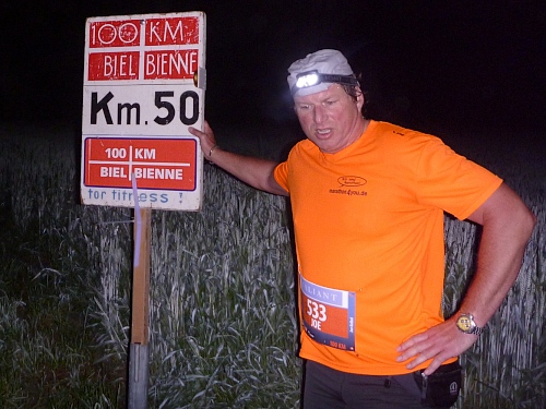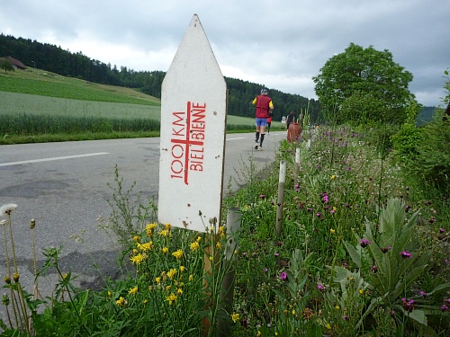 Beim Halbzeitschild bei km 50 versuche ich einen möglichst erschöpften Zustand zu spielen. Wenige Kilometer später, in Kernenried, sitzen wie jedes Jahr Mädchen auf der Mauer vor der Jugendherberge und jubeln uns zu. Es ist etwa 3:30 Uhr. Glaubst Du, in Hamburg, Berlin oder sonst wo wäre das um diese Uhrzeit so? Ich bin in Berlin gelaufen, 100 Meilen, ich weiss, wie einsam man in der Hauptstadt ist.