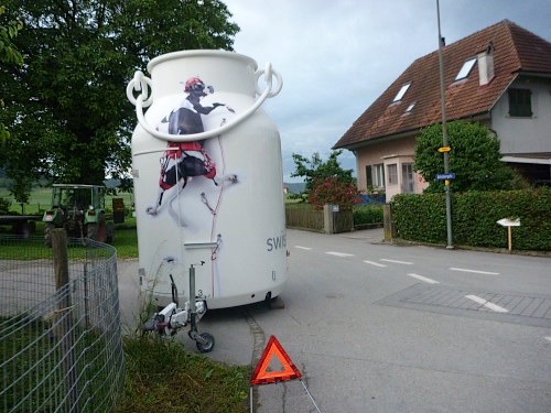 An der Kreuzung der Strasse Grafenried/Lysach ist diese Scheune mit dem Holzpodest davor, wo Mädchen jedes Jahr tanzen, als hätten Läufer Dollarnoten dabei. Dank zweier Paletten gelingt mir der Aufstieg bis zur Schankanlage. Ich habe Magen. Hopfen beruhigt bekanntlich und ich sehe so bekloppt aus, dass ich Freihopfen bekomme. Deutschland verliert morgen gegen Portugal, höre ich. Bin schlagfertig und frage, in welcher Gruppe die Schweiz spielt.
