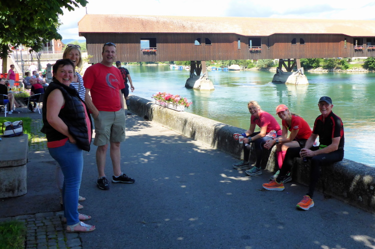 Mit dem Bier in Arch beginnt der schöne Abschnitt des 100ers: Konnte man noch bei km 56 in Kirchberg mit Wertung aussteigen, so hat man jetzt keine Chance mehr. Man würde sich hier in der Hitze und persönlicher Scham auflösen. Zwar ist dies kein lebensfeindlicher Alpengipfel, nur ein liebliches Tal mit Schwänen und blütenweißen Motorbooten, aber Biggi sagt, ein Halbmarathon geht immer. Und Biggi hat Recht, also weiter auf der grausamen Strecke!