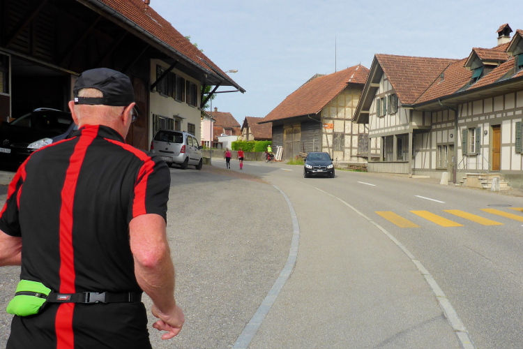 Wie eine Reihe Friedhoflichter, so formieren sich die roten Rückleuchten der Fahrradbegleiter, die über die nächtlichen Hügel der ansonsten freundlichen Landschaft, sich bis zum Horizont reihen. In Jegenstorf, km 47, ist es dieses Jahr fast schon hell, was bestimmt an der Klimaerwärmung liegt. Für mich von Vorteil, ich sehe erstmals diese unglaublich imposanten Farmhäuser. Einen Landwirt, der gerade einen Haufen Mist direkt an die Laufstrecke befördert, frage ich, wie viele Leute denn in diesem Prachtbau wohnen würden: „Vier!“ – „Wie vier? Keine Großfamilie? Keine 12 Kinder? Keine Untermieter?“ – „Nö, Vier!“ Blöd, eigentlich ist die Rolle des wortkargen Morgenmuffels mir vorbehalten! „Hüssligässli“ ist die Bezeichnung für den Weg zu seiner Großburg. Oh glückliches Alpenland! Wir sind am südlichsten Punkt der Strecke, wechseln nun die Laufrichtung nach Nordost.