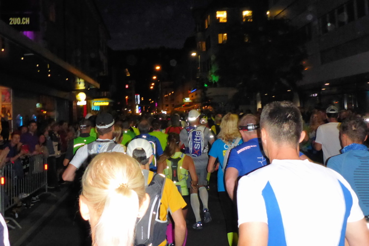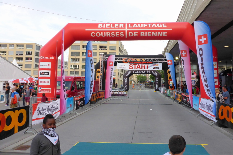 Kommt man nach Biel, sind es nur 5 Minuten vom Bahnhof zum Congress Center. Geradeaus, dann rechts. Vor dem Bahnhof sieht man Aldi, links Migros. Man sollte Franken und Getränke kaufen, um die Zeit bis zum Start um 22 Uhr zu überbrücken. Die Preise hier sind gewaltig, eine Portion Nudeln auf der Pastaparty kosten 12, ein Bier 5,50 Franken. Da warte ich lieber bis zum ersten Verpflegungspunkt. 18 davon gibt es auf den 100 Kilometern.