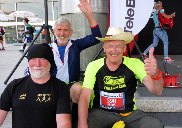 Interviewt wird gerade Helmut Urbach (75) der 1967 die 100 Kilometer in 8:11 Stunden gewann. 1969 Streckenrekord in 7:55. Fünf Jahre später lief er dann unter 7 Stunden. Niemand hat Biel öfters gewinnen können (siebenmal), als der Kölner mit den Barthaaren, die dem Dax-Index folgen.