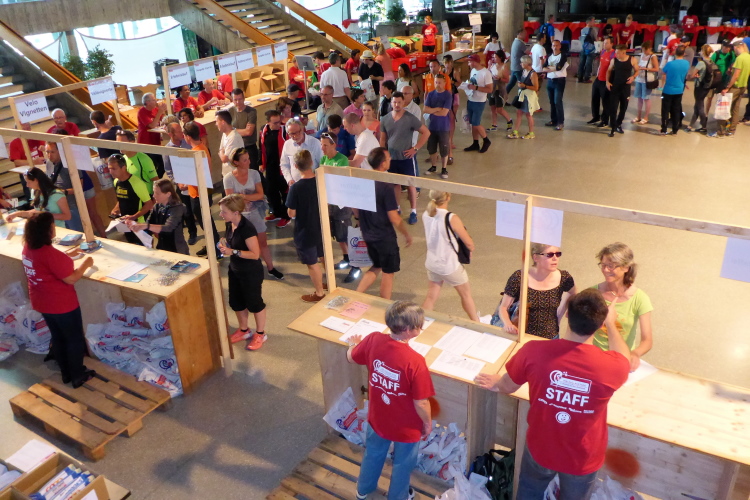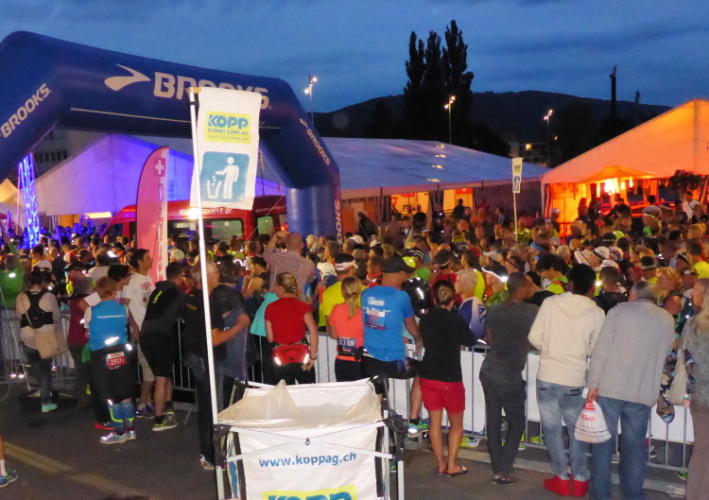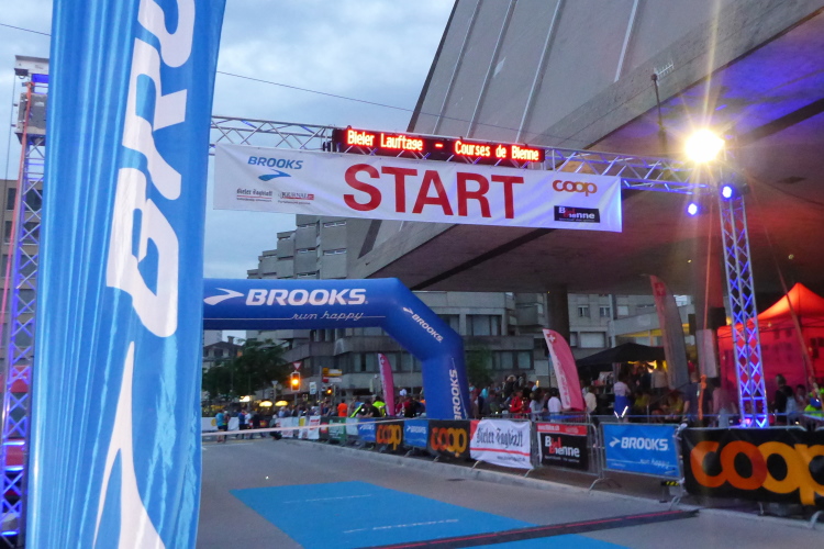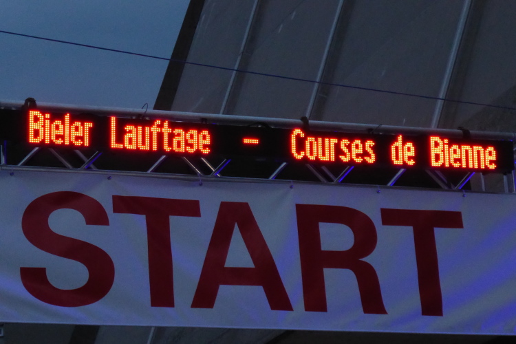 Wir reisen bereits am Donnerstag an. Unsere winzige Bed und Breakfast Unterkunft ist nur wenige hundert Meter vom Kongresshaus entfernt. Weil in Biel Parkplätze Mangelware sind, gibt es auch am Hotel keine. So machen wir uns auf den Weg zur Startunterlagenausgabe. Auf dem Platz vor dem Kongresshaus gibt es kostenfreie Parkmöglichkeiten. Das nehmen wir gerne an. Nachdem wir die Startunterlagen samt Startertasche bekommen haben, verschaffen wir uns einen Überblick über das Gelände: Vor dem Kongresshaus ist der Starterbogen aufgebaut und die Schülerläufe sind in vollem Gange. Auf der anderen Straßenseite, auf dem großen Platz gibt es ein Festzelt und ein zusätzliches Barzelt. Die Sporthalle Esplanade, wo im letzten Jahr das Massenlager für die Läufer war, ist abgeschlossen. Die Kollektiv-Unterkunft ist in diesem Jahr in der Zivielschutzanlage Sahligut ca. 3 km vom Start entfernt. Laut Veranstalter werden Shuttlebusse eingesetzt.