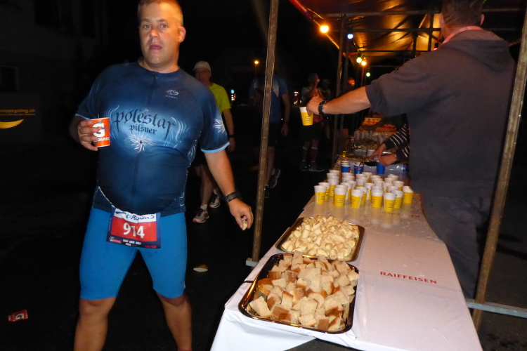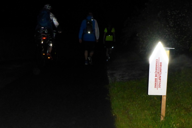 Der nächste Tag beginnt mit einem späten Frühstück. Gegen Mittag wandern wir zum Auto, um uns dort nochmals abzulegen, denn die Nacht wird lang. Hier heißt es, bitte die Tiefgarage nutzen. Hier gibt es laut Ausschreibung Sondertarife für das Laufwochenende. Nach einiger Verwirrung am Infoschalter erhalten wir ein blaues Parkticket, das uns für 15 Franken, 24 h Parkzeit gewährt. Dort steht das Auto zwar sicher, aber wir bekommen vom Leben über uns nichts mit. Gegen 21 Uhr machen sich an den Nachbarfahrzeugen die Fahrradbegleiter bereit. Nach einem Briefing werden sie um 21 Uhr 30 mit Polizeischutz nach Lyss eskortiert.