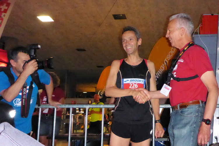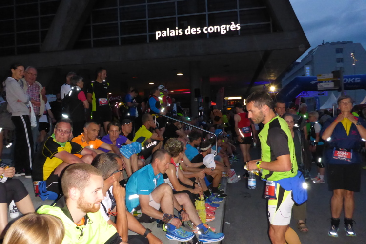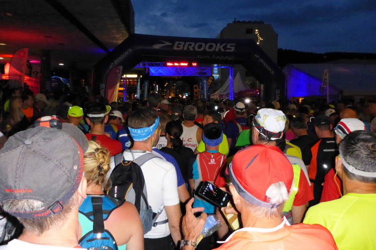 Dann wird es auch für uns Zeit. Die Dämmerung hat bereits eingesetzt und taucht den Startbereich in die typische Biel-Atmosphäre: Vorstart-Spannung im Abendrot. Der abgesperrte Startbereich vor dem Kongresshaus ist leer. Dafür sind die Straße und die Treppe vor dem Kongresshaus mit Läufern bevölkert. Mittendrin im Getümmel erfolgt die Ehrung diverser Jubilare. Vermutlich sind die meisten Läufer gerade mit sich selbst beschäftigt, so dass die Zeremonie etwas untergeht. Zusätzlich zu der traditionsreichen 100 km Strecke wird zum ersten Mal auch ein Ultramarathon über 56 km ausgetragen.