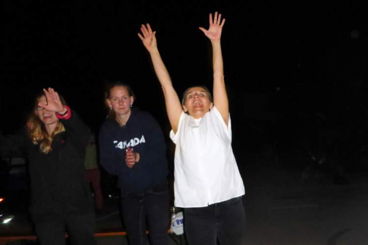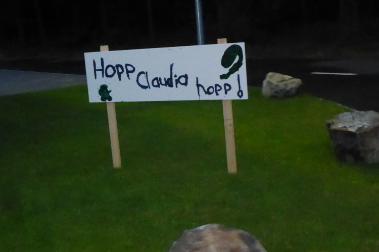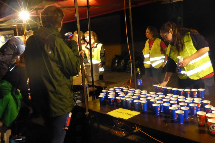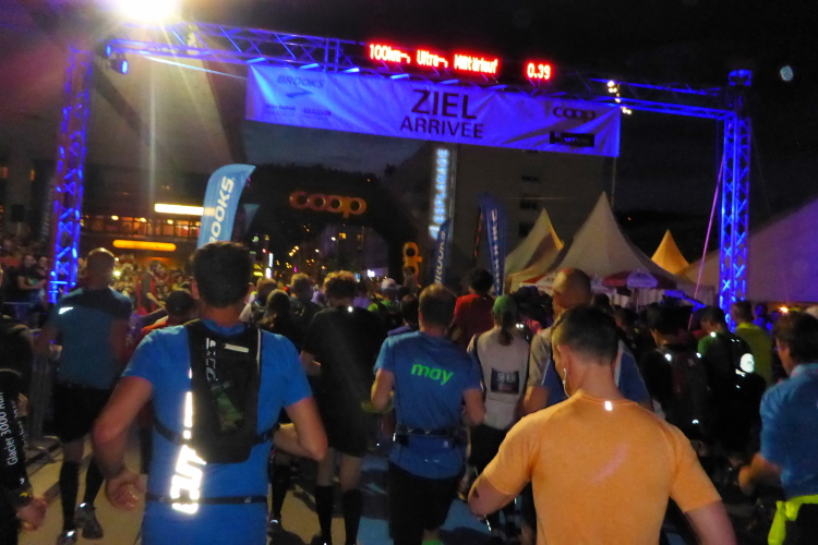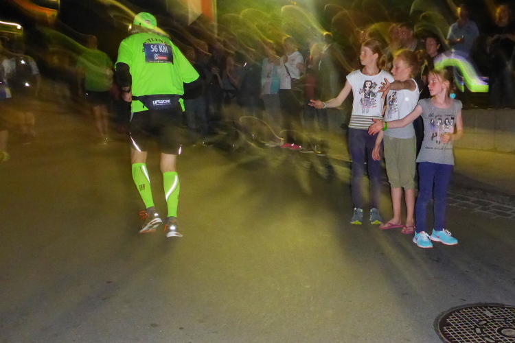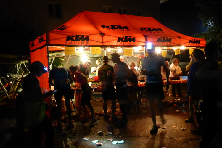 Der Wind frischt jetzt kräftig auf und wird zu einem regelrechten Sturm. Schon seit einiger Zeit wird der nächtliche Himmel von hellen Blitzen erleuchtet. Für 2 Uhr ist Regen angekündigt. Das ist noch eine Weile hin; wir haben ja noch nicht einmal Mitternacht. Gerade denke ich noch daran, da spüre ich schon die ersten Tropfen. Kein Problem, ein bisschen Regen macht mir nichts aus. Immer mehr Läufer bleiben stehen und holen Jacken aus ihren Rucksäcken. Soll ich, oder soll ich nicht? Dann wird mir die Entscheidung abgenommen. Ein Schauer geht nieder und binnen einer Minute bin ich vollständig durchnässt. Da ein Ende des Regens nicht absehbar scheint, fummle ich aus meinem Rucksack meinen Notfallregenumhang, eine dünne Folie mit Arm- und Kopflöchern. Leider kann ich in der Dunkelheit und dem böigen Wind nicht die richtigen Öffnungen finden und stülpe mir daher das Teil über, wie es gerade kommt. Es ist nicht optimal und so suche ich Schutz unter einem Partyzelt. Als ich gerade meinen Umhang zurecht rücken will, fangen die Zuschauer an, das Zelt abzubauen. Der Wind ist so stark und könnte das Zelt beschädigen. Bevor mir das Dach über dem Kopf weggezogen wird, habe ich aber mein Ziel erreicht. Mein Umhang sitzt jetzt wenigstens einigermaßen richtig.