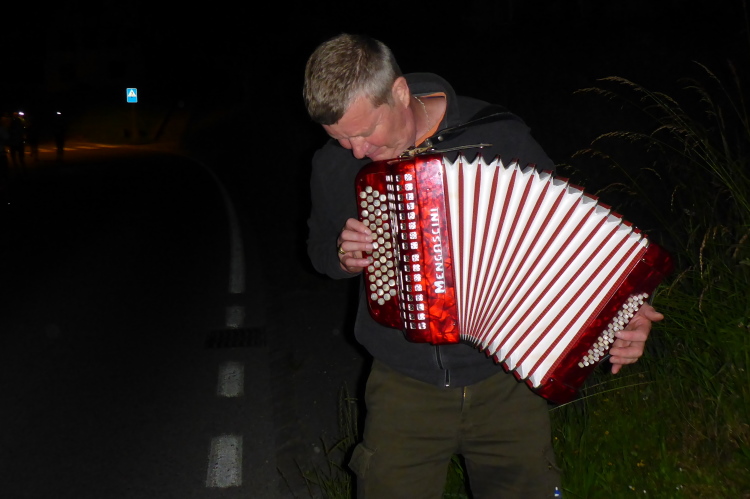 Das erste Schild zeigt km 5. Dahinter folgt eine Steigung, an der sich die Anwohner eingefunden haben, um die Läufer abzuklatschen. Die meisten meiner Mitstreiter laufen hier herauf. Mir ist das zu steil und so gibt es die erste Gehpause. Schon von weitem hört man die dunklen Klänge eines Alphorns. Tatsächlich steht oben an der höchsten Stelle ein junger Mann, ganz in sein Spiel vertieft. Die Läufer quittieren das mit anerkennenden Worten. Bald geht es wieder bergab. Hier steht ein weiterer Musikenthusiast mit Akkordeon - welch nette Idee.