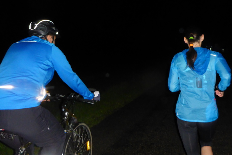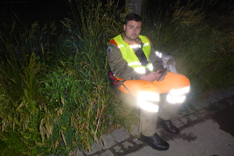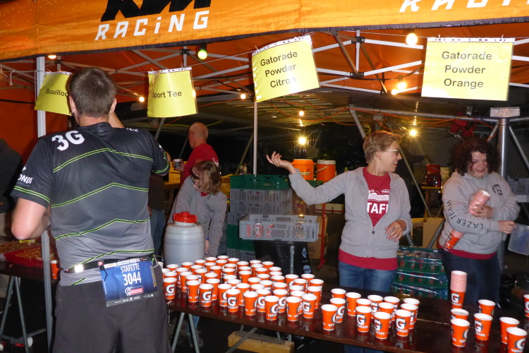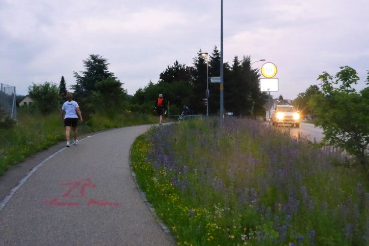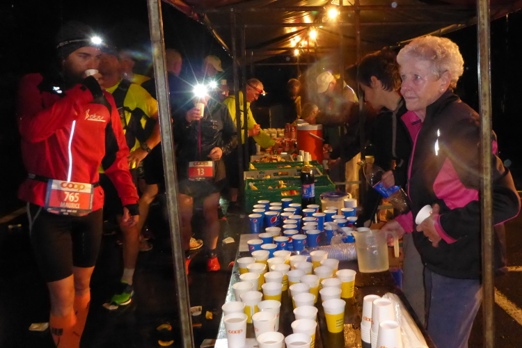 Der Regen lässt nicht nach und schnell ist aus dem Weg eine einzige Pfütze geworden. Ein Radler klingelt hinter mir und kündigt den Führenden des Halbmarathon an. Der Start vom Halbmarathon war um 23.30 und der der Militär-und Zivilstaffel war eine Stunde nach unserem. Durch den Regen hindurch, versuche ich einen Blick auf die Läufer zu werfen. Sie sind schnell unterwegs und alle leicht gekleidet. Ab jetzt kommen immer öfters schnelle Läufer von hinten, die sich im Slalom durch das Ultrafeld bewegen.