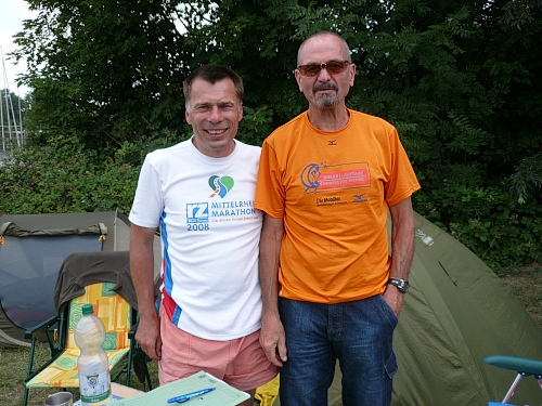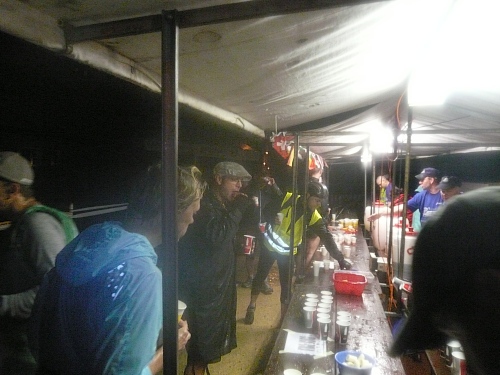 Im Festzelt steht die Regenbrühe. Der Umkleidebereich ist mit Rindenmulch ausgelegt, aber viel zu klein. Der Mief zieht vom Toilettenwagen herein. Kein Läufer ist mehr in seinem Campingzelt, die schwimmen weg. Ziemliches Gedränge und prämarathonale Schwüle. Hier und da versuchen einige noch eine Mütze Schlaf zu bekommen. Grausame Wartezeit im Gedränge der transpirierenden Ultrakämpfer.