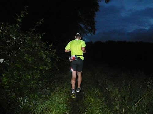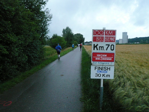 Noch kann ich den Fotoapparat in meiner Hand schützen. Innenstadt, Nidau, Port, Bellmund, Jens, ich seh nichts mehr, die braunen Reste einer Kuhherde vermischen sich mit Unmengen Wasser und spritzen mir ins Gesicht. Flatsch-Flastsch. Die braunen Suppe leuchtet silbern im Schein der Strinlampen. Der Geruch von Freiheit und Weidegrund liegt über der Läuferschar. Dank meiner Stirnrlampe kann ich den tiefsten Pfützen ausweichen. Es gibt kein nächtliches Tap-Tap, es gibt ein demoralisierendes Platsch-Platsch. Kappelen: Platsch-Platsch. Es dröppelt auf dem Kopf. Das ist Waterboarding der feinsten Art!