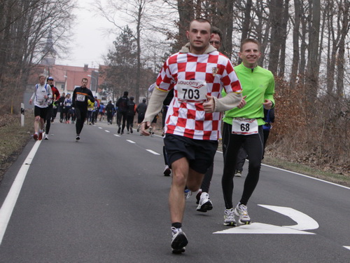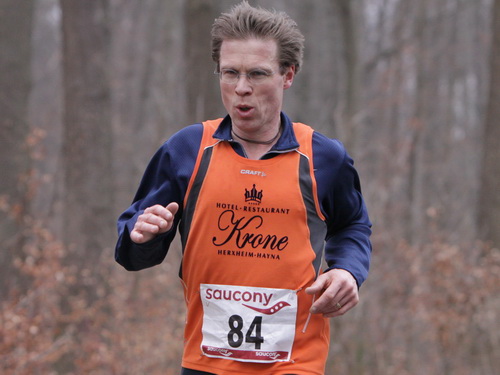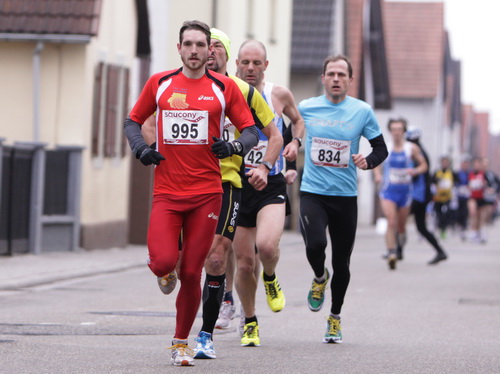 Pünktlich geht es los und mir zeigt sich sofort, daß es sich im Gegensatz zu vielen anderen Veranstaltungen nicht um einen 08/15-Volkslauf handelt, sondern daß hier sehr viele „Profis“ am Start sind. Denn es gibt, ganz im Gegenteil zu sonst, keine hektischen Überholmanöver in der Anfangsphase. Jeder kennt sein Leistungsvermögen und stellt sich entsprechend auf, sehr angenehm. So finde ich noch auf den ersten beiden km durch Kandel Downtown zwei Elsässer, deren Tempo mir gut passt. Ich beschließe, mich anzuhängen und sie als Windschatten zu mißbrauchen, denn außerhalb der Ortschaft bläst es ganz ordentlich.
