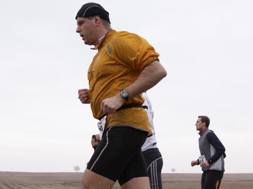 Die Strecke ähnelt übrigens mit sehr viel Phantasie einem auf dem Kopf stehenden Y, beinhaltet also zwei Pendelstrecken. Die erste erreichen wir nach knapp 15 km und haben sie zur Halbmarathonmarke (1:52 Std.) wieder verlassen. Dann geht es richtig tief in den Wald. Schön ist es einerseits, die schnellen Cracks entgegenkommen zu sehen: Heiko sieht für mich gut aus und vermittelt einen starken Eindruck. Andererseits weiß ich, daß diejenigen, die mir bei km 22 entgegenkommen, schon gut 31 hinter sich haben. Puh, 5 km hin und auf gleichem Wege wieder zurück. Bei km 19 bin ich auf Peer Schmidt-Soltau aufgelaufen, der durch seine langen Haare immer schon von weitem auffällt. Auch er ist ein Einzelläufer unseres Staffelmarathons 2009 in Waldbreitbach, wir laufen etliche km zusammen und unterhalten uns prächtig. Das lenkt ab.