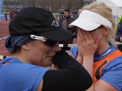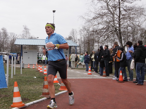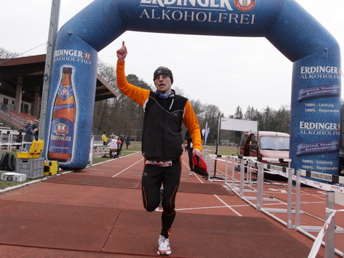 Parallel zum Stadion sehe ich die verheißungsvolle „42“ auf der Tartanbahn stehen und schalte den iPod ab. Die Dreiviertelrunde geht jetzt auch noch ohne Mucke. Dann endlich schlüpfe ich unter dem blauen Zielbogen hindurch und habe es geschafft. Mit den erzielten 3:45:59 Std. muß und kann ich zufrieden sein. Bin es auch. Trotzdem: Nur 312. Mann von 537! Ja, da haben wir heute ein starkes Feld zusammen.