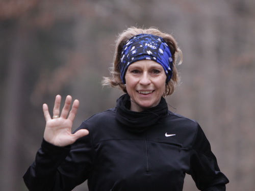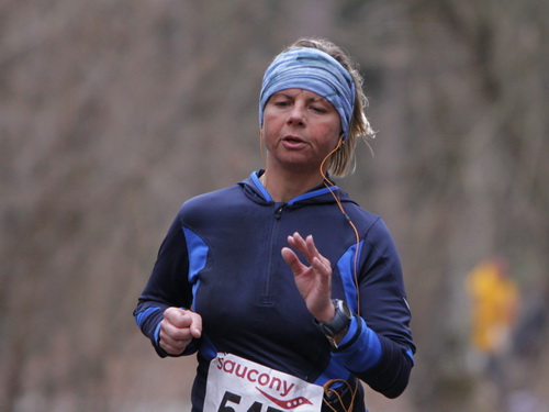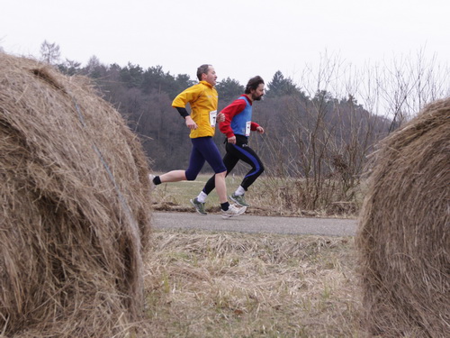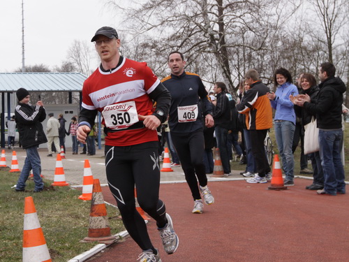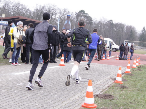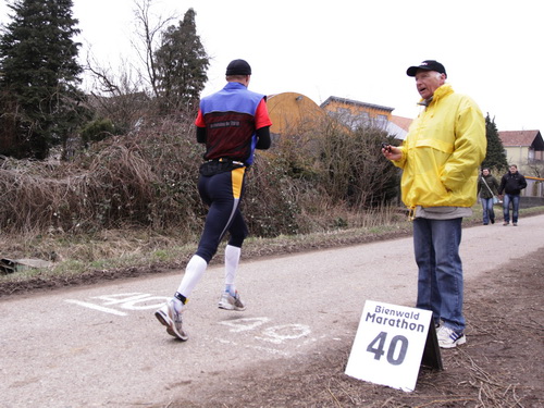 Gefühlt bekomme ich langsam kaum noch ein Bein vor das andere und warte ab etwa km 37 ständig auf den Einbruch. 5:38 min. für km 38, es geht abwärts. Komischerweise werde ich anschließend wieder schneller. Keine Ahnung wie, aber es funktioniert. Nach dem Austritt aus dem Wald bläst mir bei km 39 der Wind eiskalt entgegen. Meine Güte, findet der Winter denn nie ein Ende? Ich darf aber nicht meckern, schließlich waren für heute Regen und Schnee angekündigt, von beidem bisher keine Spur.