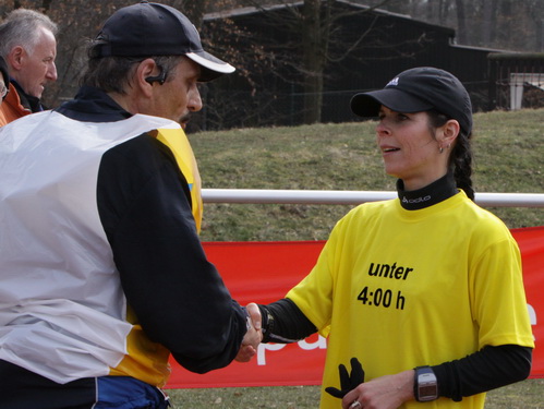 Heiko hatte ich zweimal mit einen Begleiter gesehen, nach dem Halbmarathon-Wendepunkt war er auf Rang 4 mit Blickkontakt zum 3. und 2. Bei km 14 konnte er den Dritten, bei km 27 Thomas Dehaut überholen, der bis dahin Zweiter war. 10 km lang träumte er vom Doppelsieg seiner Truppe, da er sich sicher war, daß Ralf Nacke (der spätere Sieger) das Ding nach Hause laufen würde und er nach wie vor super Beine hatte. Km 37 kam dann wieder in 3:39 und er wollte ab km 40 nochmals beschleunigen. Wie gesagt, wollte... Auf dem kurzen Stück gegen den Wind (km 37-39) wurde es dann nochmals sehr zäh und hart für ihn und Harald Seidl konnte ihn zentimeterweise distanzieren. Bei km 41 noch einmal angetreten, kam er aber nur unbedeutend näher. Was soll’s! Der vorher vorsichtig anvisierte Platz Drei gehört tatsächlich Heiko!