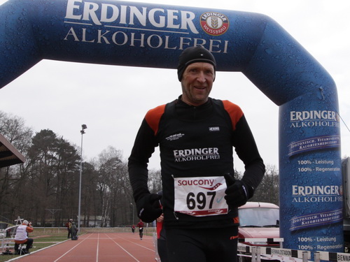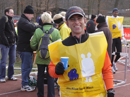 Das Helden-Finisherbild vom Klaus kommt erst zustande, nachdem die Sonne mir zu Ehren kurz durchbrochen ist und ein freundlicher Helfer einen warmen Tee gebracht hat, toller Service! Da kann ich schon wieder strahlen. Ein Ganzkörperkondom hatten sie mir auch direkt übergestreift. Also wirklich, hier wird sich gekümmert! Keine Spur vom 3:45er Troß, da hat sich wohl der Zugläufer unterwegs verabschiedet. Oder war ich so im Delirium, daß ich den Überholvorgang nicht bemerkt habe?