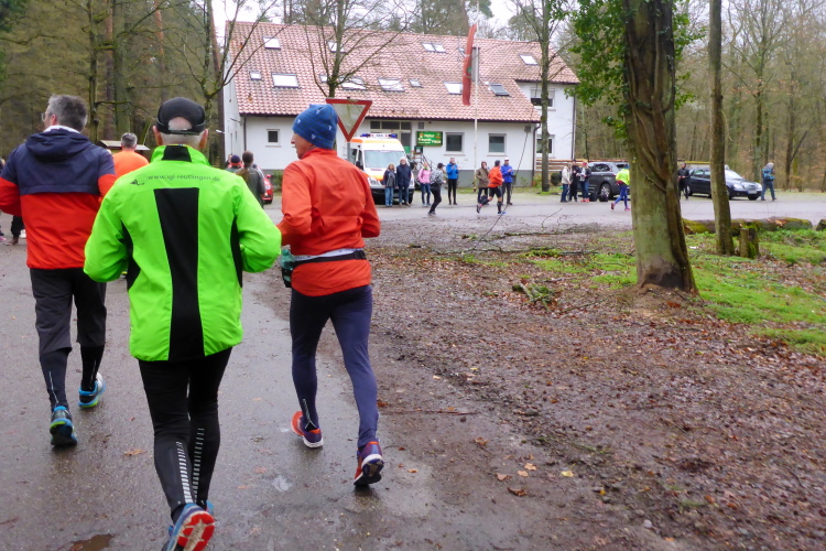 Obwohl es gerade nicht regnet, versuchen wir so lange wie möglich in der Halle zu bleiben. Kurz vor 10 Uhr erst gehen wir nach draußen und schon beginnt der Lauf. Es müssen an die 2000 Starter sein; zwei Drittel davon sind für den Halbmarathon gemeldet. Zuschauer verabschieden uns mit überschwänglichem Applaus. Norbert und ich bleiben erst mal hinten und können so die lange Schlange der vor uns Laufenden betrachten. Gerade im tristen Wintergrau sind die vielen bunten Shirts ein richtiger Blickfang. Es geht nach Kandel hinein. Hier stehen einige Schlachtenbummler und zollen bewundernden Beifall.