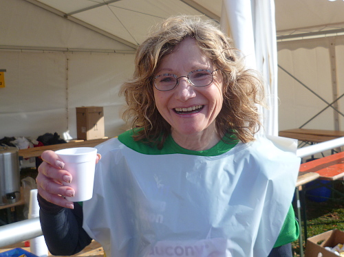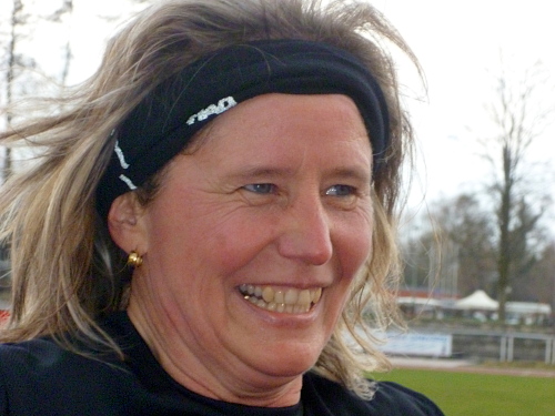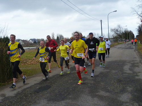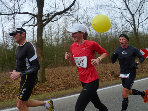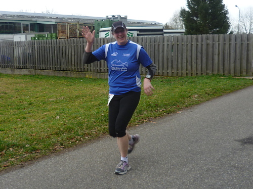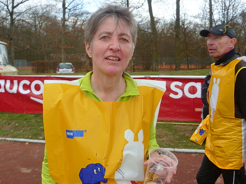 In ziemlichem Abstand erst kommen die beiden Verfolger - und dann geht es Schlag auf Schlag. Zuerst einzeln, dann in immer größeren Gruppen laufen die Halbmarathonis an uns vorbei. Sie sind ganz schön flott. Auf unserer Seite dagegen geht es eher gemütlich zu. Jetzt kommt auch die führende Frau Jutta Brod. Mit einem lockeren Spruch läuft sie an mir vorbei!