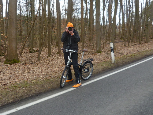 Dann habe ich eine Begegnung der dritten Art: Klaus auf dem Fahrrad. Leider sieht er mich und steigt ab, bevor ich das Bild des Jahres machen kann.