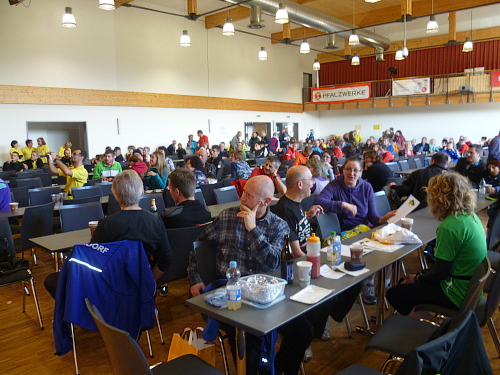 Die nahe Bienwald-Halle ist wieder Läufertreff. Noch immer sind hier die Masseure im Einsatz. Bei vielen Veranstaltungen gibt es diesen Service um diese Zeit nicht mehr. Wir lassen unsere Urkunden ausdrucken, verzichten aber auf die Medaille, die man für ein kleines Entgelt erstehen kann.
