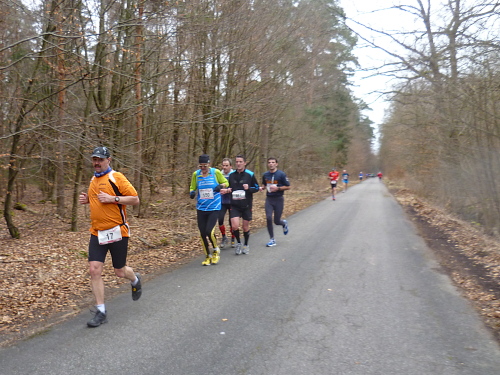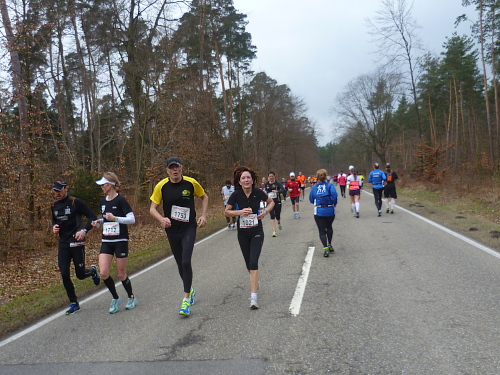 Nach einer Schleife erreichen wir Kandel. Hier stehen ein paar Schlachtenbummler. Auch aus den Fenstern heraus werden wir bejubelt. Auf der gesperrten B427 laufen wir nach Minfeld. Vier mächtige Windräder drehen sich träge. Hinter Minfeld geht es in den Wald. Über einen schmaleren Teerweg erreichen wir die K16, der wir bis zur K 15 folgen. Beide Kreisstraßen sind für den Verkehr gesperrt. Wir laufen jetzt auf der rechten Seite, denn links werden schon die ersten Halbmarathonläufer erwartet. Und tatsächlich: Das Polizeimotorrad fährt dem Führenden, Peter Keinath, voraus. Er wird das Rennen souverän nach Hause laufen und mit über 2 Minuten Vorsprung gewinnen.