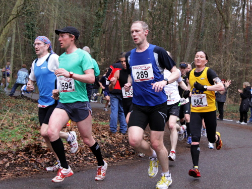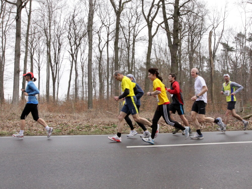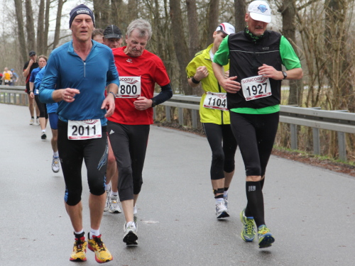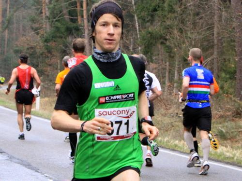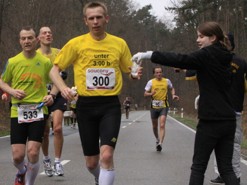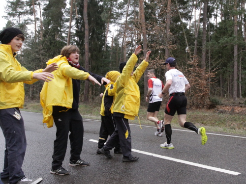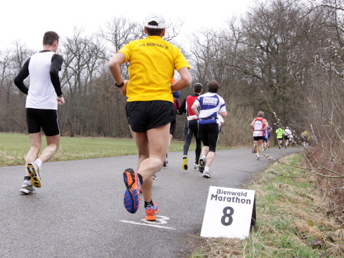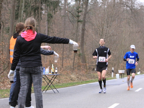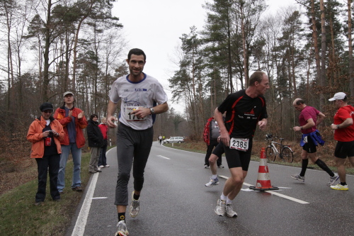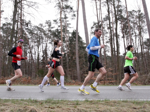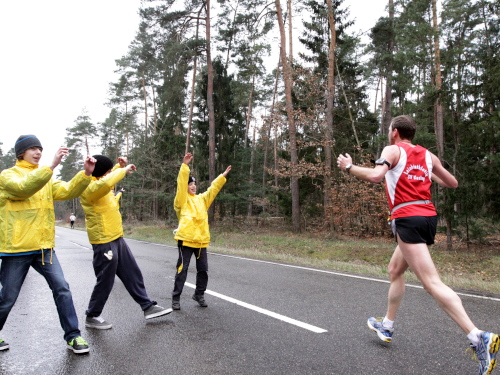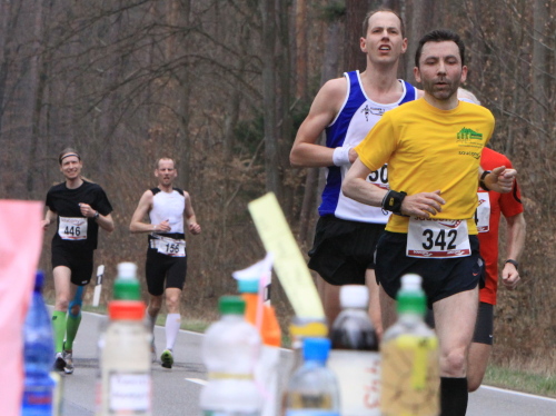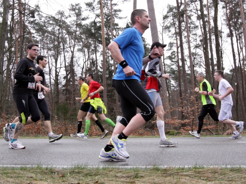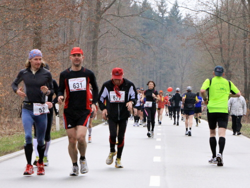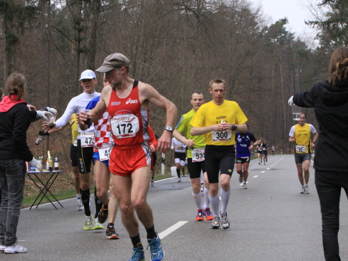 Auf dem Abschnitt bis zur ersten Wende (ca. km18) wurden wir durch die entgegenkommenden Marathonis abgelenkt, auf dem Rückweg aber wurde es ziemlich einsam, bis es bei Kilometer 22 rechts weg zur zweiten Wende ging: fünf Kilometer hinein in den Wald, wenden und dieselbe Strecke wieder hinaus. Hier war wieder Leben auf der „Gegenfahrbahn“ und da wir unser Tempo immer noch halten konnten, überholten wir auf diesen zehn Kilometern einige, die nicht mehr ganz so fit waren.