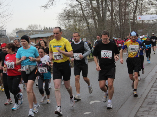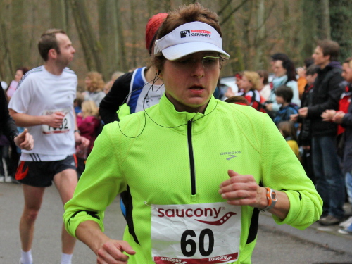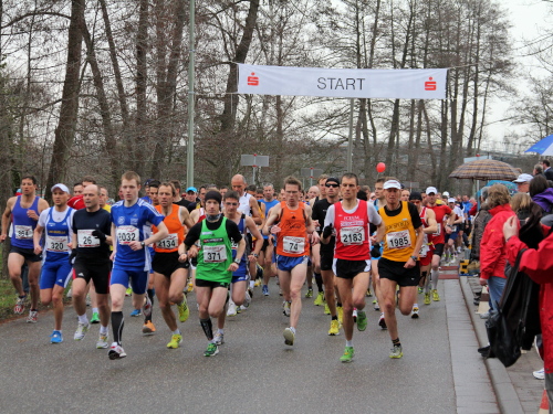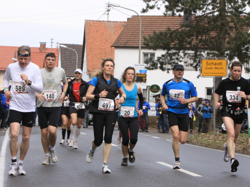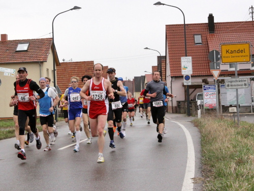 Auch in Kandel ist der Start um 10 Uhr und traditionsgemäß gab Ministerpräsident Kurt Beck das Signal. Nach zwei Minuten waren auch wir über den Zeitmatten und das „Rennen“ konnte beginnen. Wie so häufig lief Angelika schneller los als geplant und ich versuchte mit Hilfe meiner Uhr und den ersten Kilometermarkierungen das Tempo zu justieren.