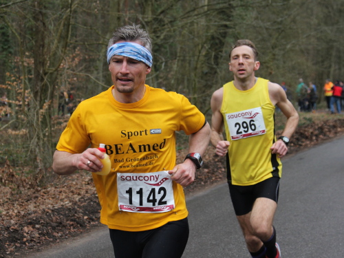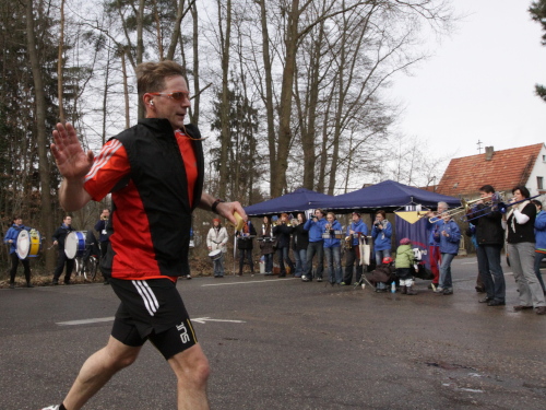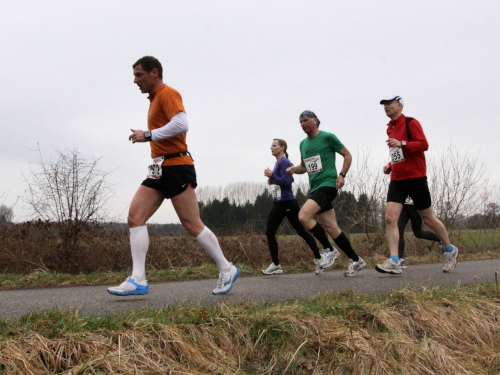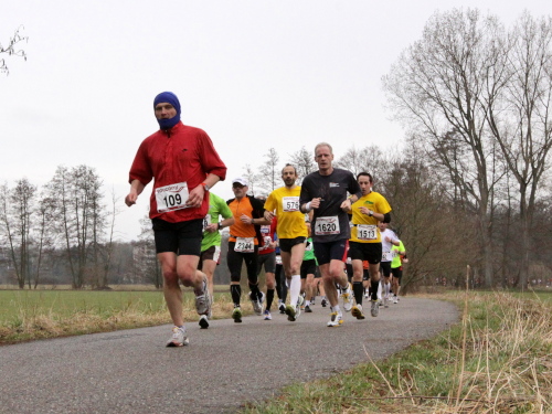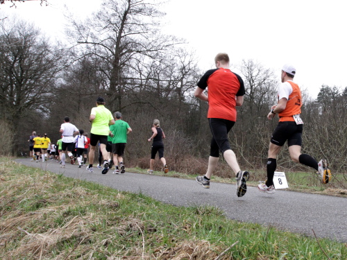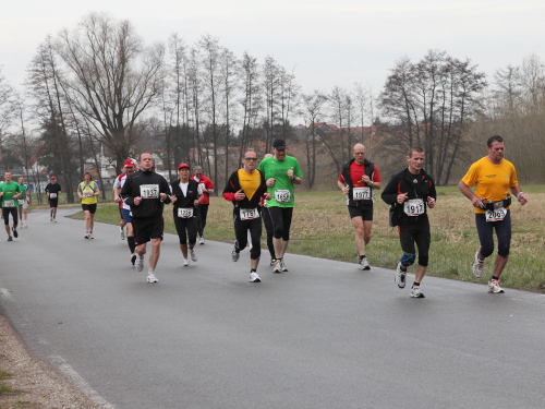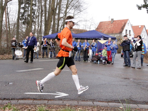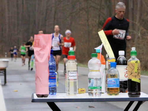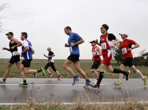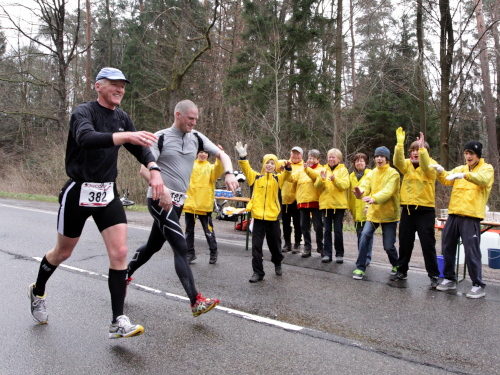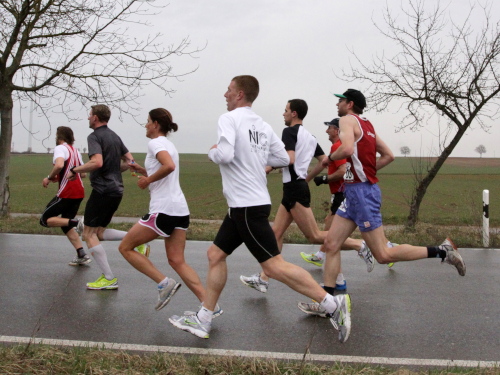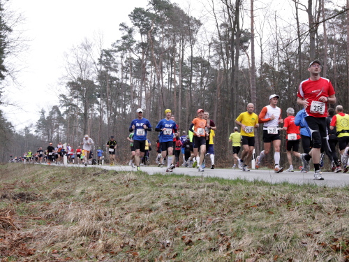 Wir waren wieder zurück auf der Kreisstraße und hatten jetzt die etwa sechs Kilometer nahezu gerader Straße vor uns. Mein Gefühl hatte mich nicht getäuscht, wir konnten auch jetzt noch das Tempo halten und verschwendeten keinen Gedanken an eine Gehpause. Drei oder vier weitere Mitstreiter konnten wir hier überholen, bevor es dann wieder links weg in den Wald ging.