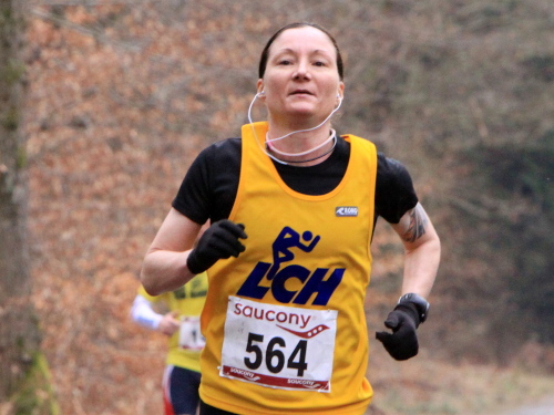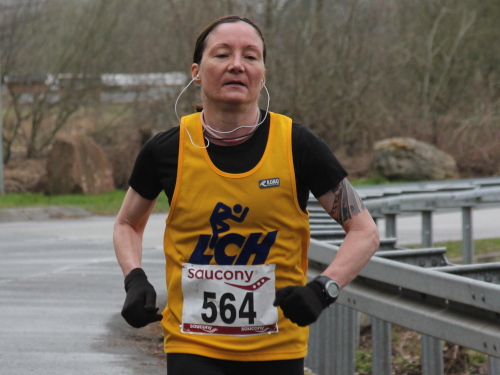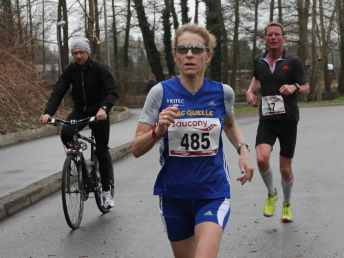 So weit aber war ich noch nicht. Bereits zwei Kilometern bevor ich auf diesen Abschnitt einbog, war mir der führende Halbmarathoni entgegen gekommen, danach immer mehr und jetzt auf der Kreisstraße kamen uns jede Menge von ihnen entgegen. Diesen Abschnitt mag ich besonders in Kandel - wegen der Studien, die man machen kann, wenn man die vielen hundert entgegen kommender Läuferinnen und Läufer beobachtet.