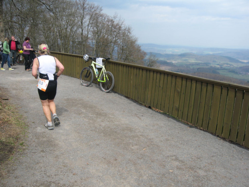 Wir trafen auch auf Vera, sie hatte die Startnummer 1 denn sie war die erste Anmelderin für diesen Marathon und persönlich mit den Veranstaltern befreundet. Sie empfand die Startnummer aber nicht als Bürde sondern erfreute sich einfach an der ihr doch so bekannten Strecke. Nach einem weiteren langen Anstieg, so bei km 24 haben wir den Bilstein passiert, Namensgeber dieses Marathons.
