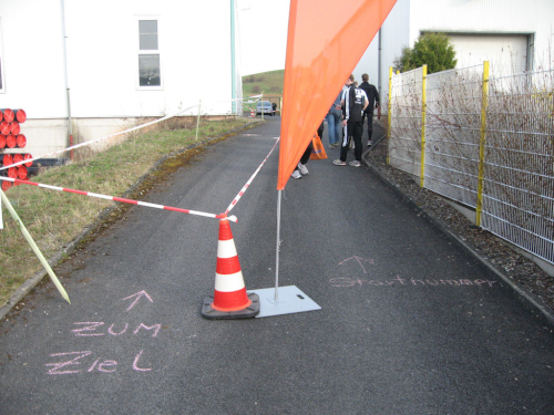 Die Startnummernausgabe erfolgte ganz gemütlich in einer großen Werkhalle. Wer wollte, konnte sich schon mal mit einem Stück Kuchen stärken. Gegen 9:45 Uhr begaben wir uns an den Start, direkt an der Werkhalle. Dort trafen wir auch bekannte Gesichter. Horst Preisler, er war bereits am Samstag in Kiel gelaufen. Auch Stefan Schlett war am Start und auch die Vielläufer Sabine Schneider und Jürgen Teichmann. 10:00 Uhr, der Startschuss war gefallen, wir haben ihn gar nicht wahrgenommen, so vertieft waren wir bereits in Gespräche. Also sind wir ganz hinten gestartet, aber dies hatten wir uns sowieso vorgenommen. Schließlich lagen doch 1029 Höhenmeter vor uns und Höhenmeter sind wir in diesem Jahr noch keine gelaufen.