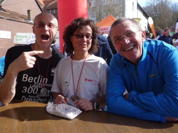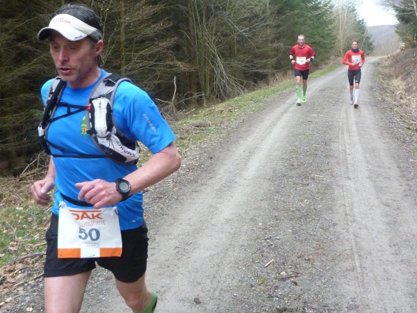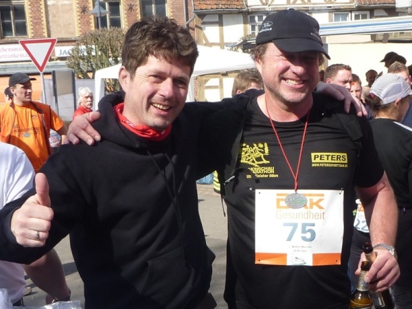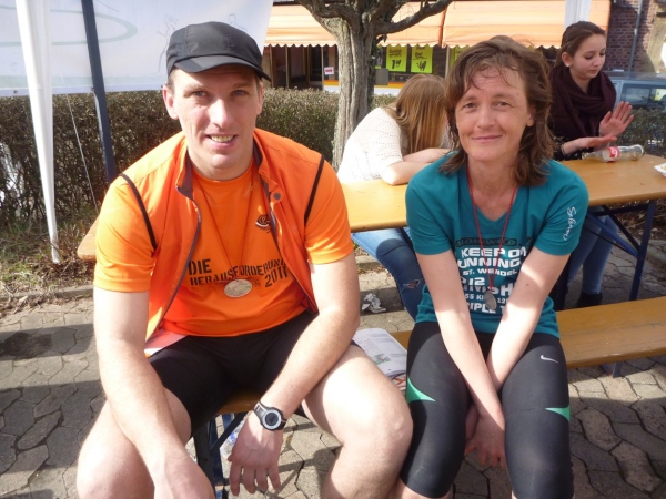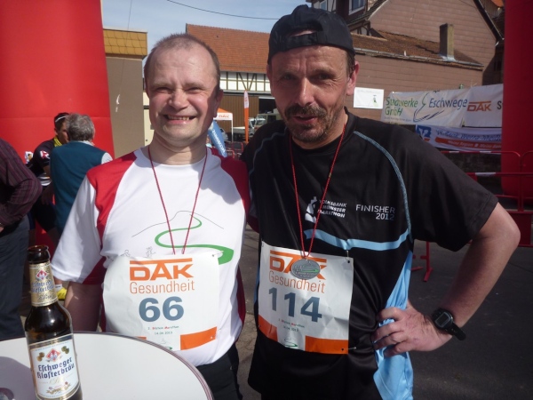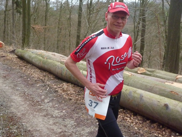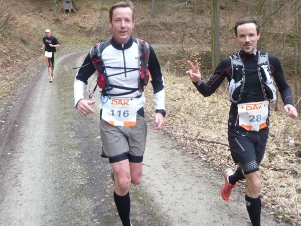 Es wird Frühling! Vor der langen Reihe der Bienenkörbe kloppen sich zwei Rammler (keine Läufer, sondern Hasen). Beim VP km 12, ich raube gerade die Dose mit den Dänischen Butterkeksen aus, da kommen Lars Donath und Thomas Herget angefetzt. Die beiden führen von Anfang an, Lars wird mit knappen sieben Minuten Vorsprung siegen. Einfach imponierend, das Tempo der beiden mitzubekommen. Ich halte also in einer Hand die Großfamilien-Keksdose, während ich mit der anderen Hand die Beiden fotografiere, wie sie vom guten Grapefruit-Bizzel trinken.