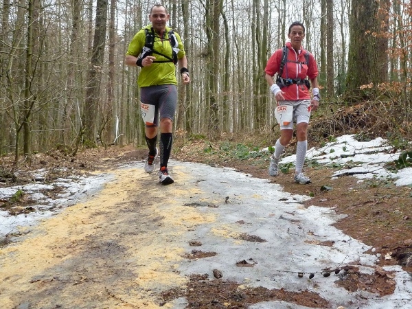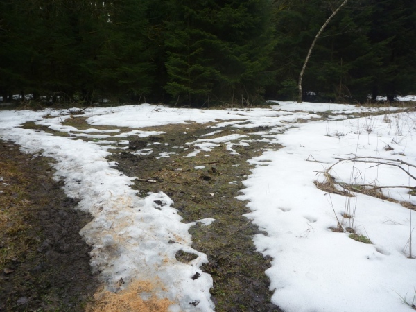 Km 24 Abzweig der Ultrastrecke, jetzt wird es lustig, das ist das, was ich will: Zunächst kommen wir zur Niestequelle, einem Zufluss der Fulda. Rostrot ist die Quelle. Es sind Eisensulfide, die aus der Braunkohle ausgeschwemmt werden. Nicht giftig, ersticken aber dennoch jegliches Leben im Bach. Aber hier oben pennt eh noch alles Leben. Es liegt noch Schnee und ich mittendrin, weil es bekloppt ist und Jörg auch fotografiert werden will, und weil wir Zeit haben und überhaupt.