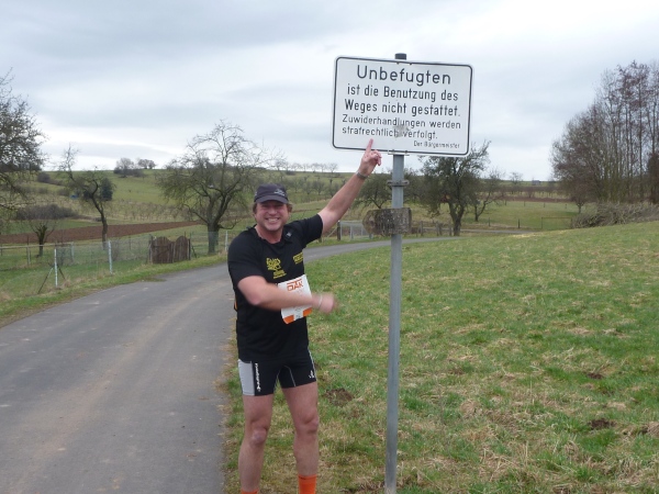 Das Gefühl, als Erster die Strecke ablaufen zu können, hat was! Die Helfer wundern sich, wo denn die anderen bleiben, aber nach mir kommen noch 50 Marathon-Wanderer, 140 Ultraläufer, 50 Lauf42er und 150 Lauf21er.