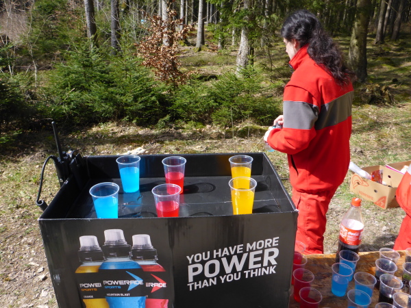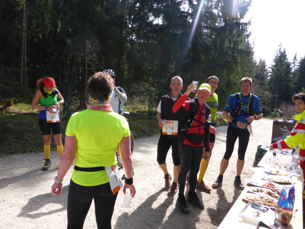 Am Gebirgspass (446 m), dem Umschwang ( km 17) gibt es Versorgung. Brutal, wie sich die schnellen Läufer ein Wasser greifen und weiterfetzen. Ich stelle mich hinter den Tisch, da habe ich die Ruhe, die ich für meine Nahrungsaufnahme brauche.