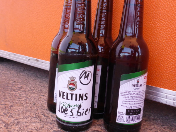Als hätte man sich abgesprochen. Einfach genial, diese Begrüßung. Ich habe jetzt 99 Wochenendkilometer hinter mir und hier stehen 5 Flaschen Bier, beschriftet mit meinem Namen. Ich kann hier Hero und VIP sein, ohne Spitzenzeiten aufzustellen! Und in 1,7 km bekomme ich den Orden, den Orden vom BilsteinUltra, dieses Jahr mit rosa Kirschblüten garniert, lecker, fast zum reinbeissen.