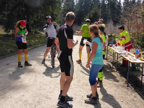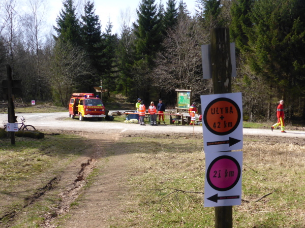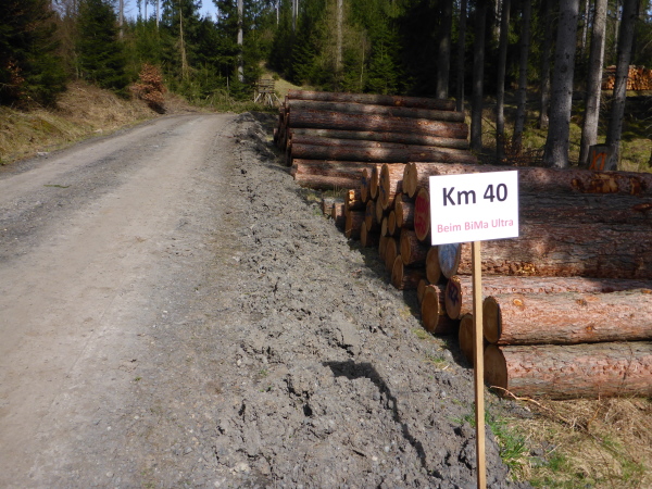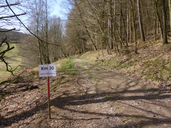 Bei km 22 kreuzen wir die Rampe, die hinauf zum Bilstein führt. Die Halbmarathonläufer fetzen jetzt dort hoch. Ich habe ein Date mit der Almwirtin. Ein älterer Bilsteinwanderer erzählt mir, dass er den Thüringen Ultra und Rennstein gelaufen ist, jetzt aber nur noch wandern kann.
