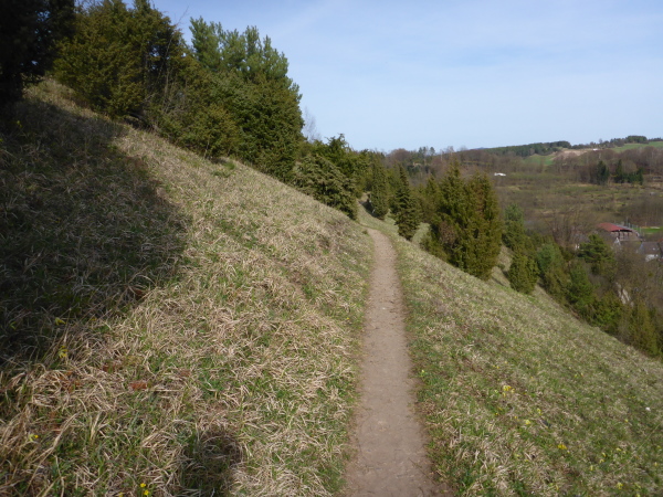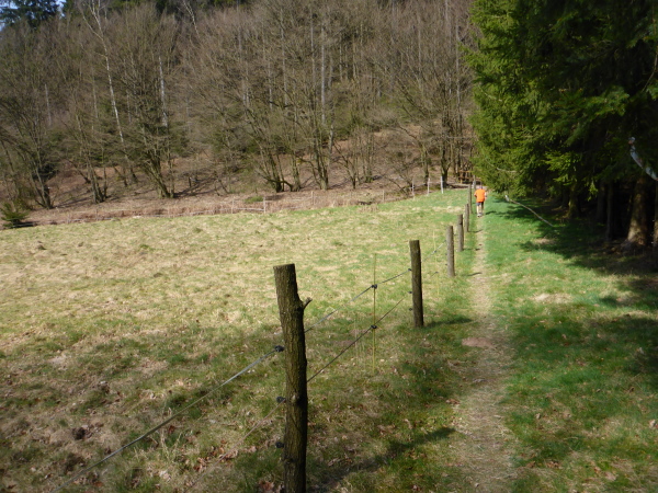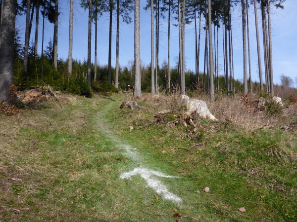 Es geht unterhalb des Steinberges Richtung Großalmerode. Nach dem Niedergang der Glasindustrie nutzte man die Tonvorkommen von Großalmerode und stellte Knicker her. Wir nannten die Kugeln, mit denen man auf dem Schulhof spielte, Klicker. Die Tonkugeln waren zu behäbig, machten meine schöneren Glaskugeln kaputt. Großalmerode hat meine Jugend zerstört! Ich muss viel Laufen!