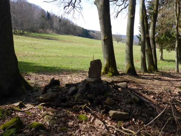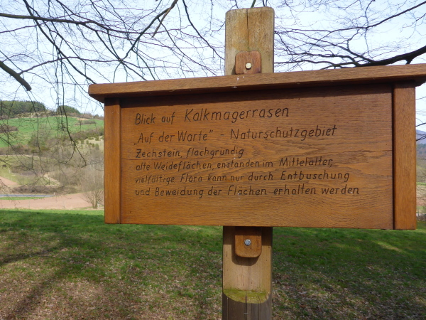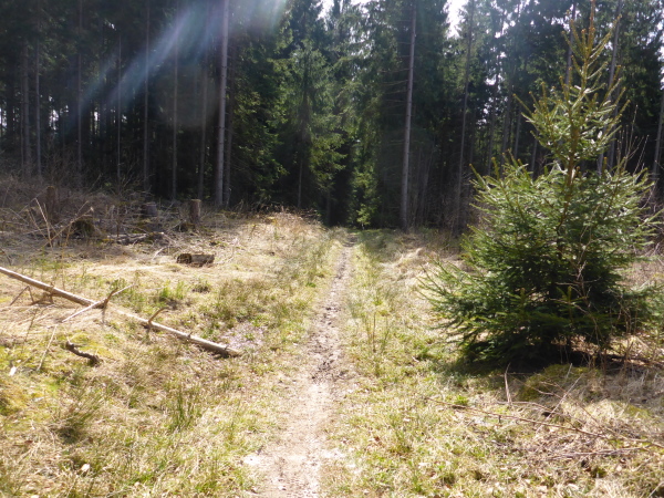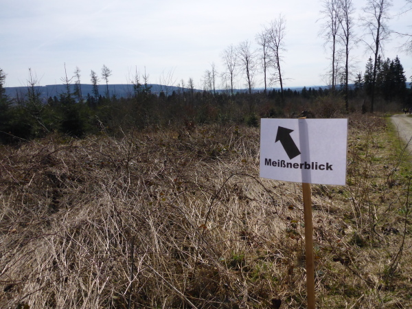 Hier am Umschwang, dem Verbindungsweg zwischen dem Fulda- und dem Werratal, wechselten die Kaufleute zwischen den Vorspannpferde der Hessischen und der Hannoveranischen „Pferdevermieter“. Wo die Schutzhütte steht, waren einst die Stallungen. Nördlich der Schutzhütte blickt man durch eine Baumlücke zur ehemaligen innerdeutschen Grenze und fast zum Kyffhäuser, den ich gestern umrudet habe, und wo Kaiser Barbarossa immer noch schläft.