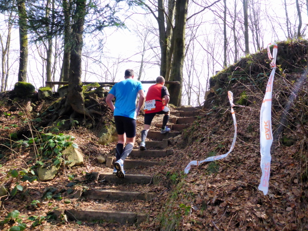 Für uns beginnt der lange, wunderschöne Lauf, rechts herum, hinunter nach Roßbach. Sehr, sehr lang ist dieser Weg, sieben, acht Kilometer. Ich weiss es nicht, muss mich auf meine schmerzenden Oberschenkel konzentrieren. Roßbach ist deshalb so interessant, weil hier der Bach verschwindet. Karstgebiet. Karst ist alter Kalkstein, der durch den Regen durchlöchert wird. Hier beim Bilstein Ultra durchlaufe ich in wenigen Stunden geologische Besonderheiten, die ein Schüler in 13 Jahren nicht kapiert. Gut, dass Ihr mich habt!