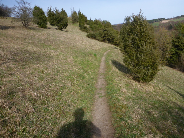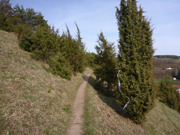 Jetzt beginnt ein wunderbares Trailrevier. Ich bin etwa bei km 52 und laufe über den Trockenhang von Roßbach mit seinen Wacholderbüschen. Oh sonnendurchflutete Schönheit! Da lacht das Trailerherz.