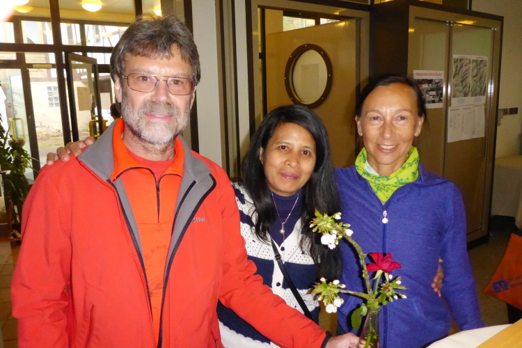 Ich bemühe mich auch, als oberhalb von Kleinalmerode auf der Wiese die Fotografen stehen. Dann geht es hinab, wieder nach Kleinalmerode und vorbei am Hühnergarten, dessen Produkte ich in meinem Rucksack transportiere. Sie stammen vom Frühstückstisch.