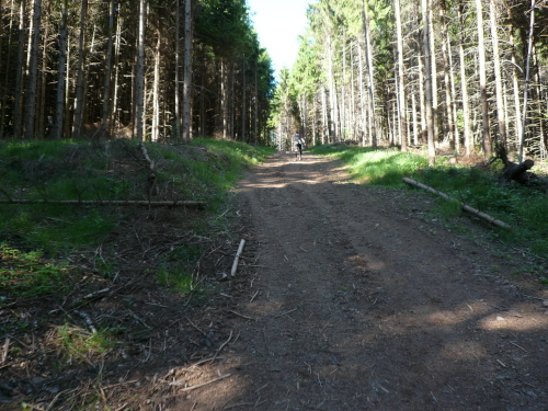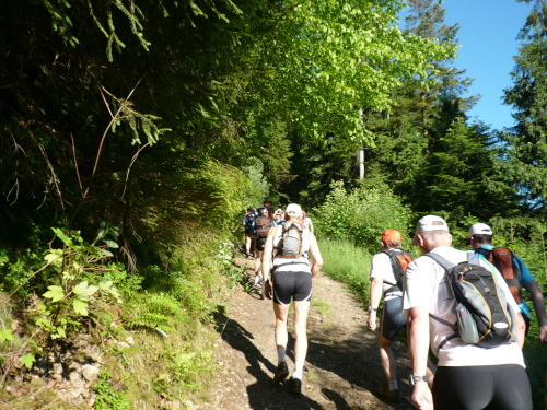 Wir verließen den gut zu laufenden Fahrweg und liefen, wie es sich für einen Trail gehört, querwaldein. Ein kurzer, sehr steiler Anstieg, machte sogar Läufer, die sonst jede Steigung laufend mitnahmen, für kurze Zeit zu Marschierern.