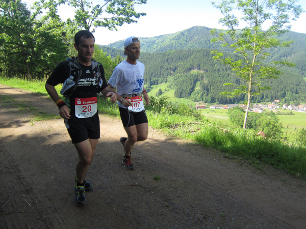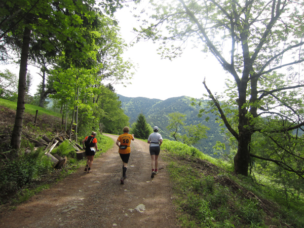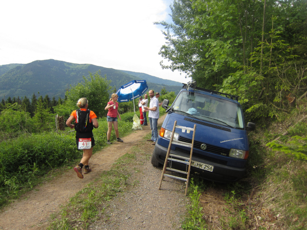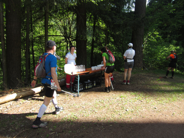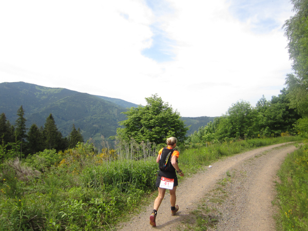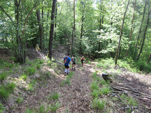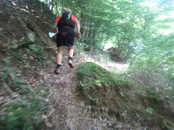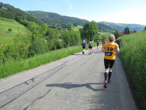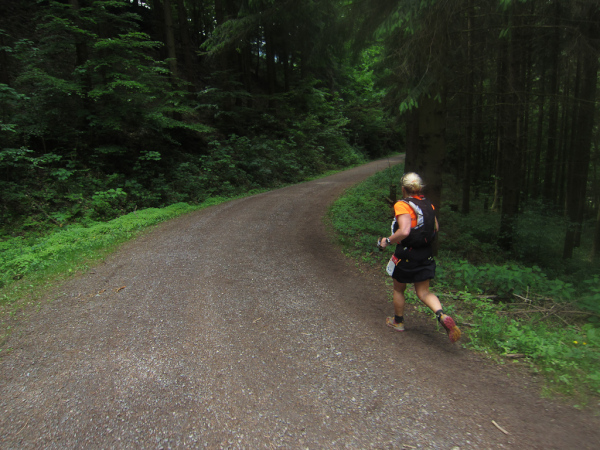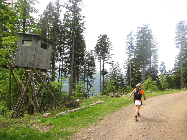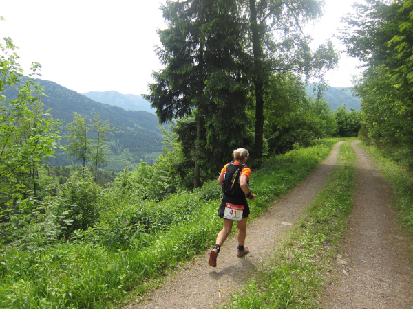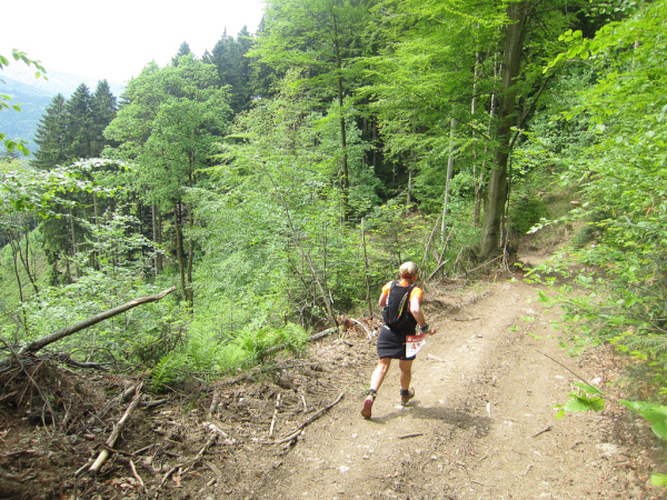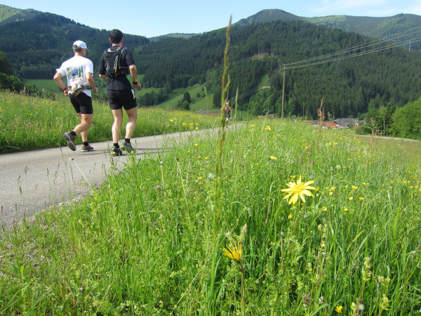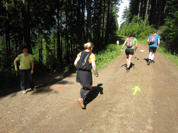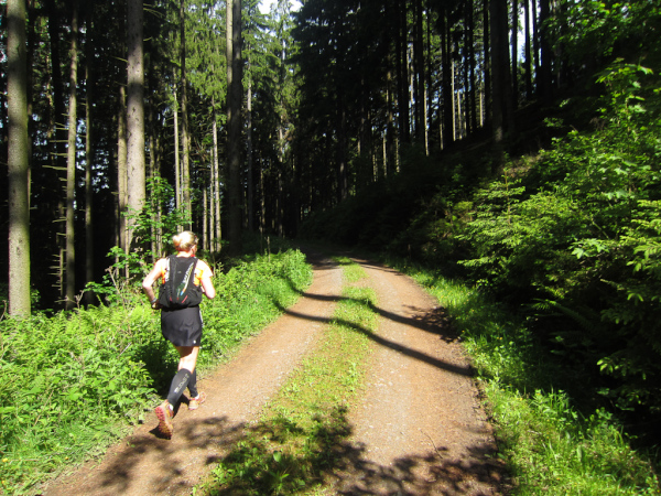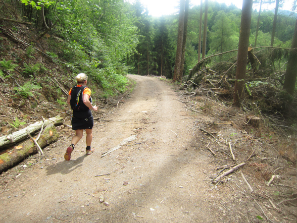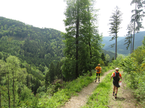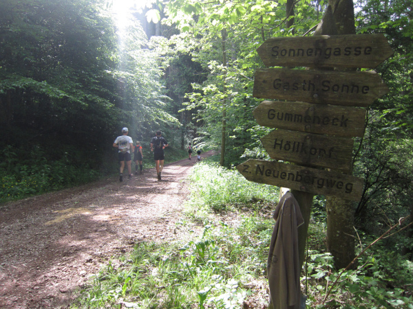 Die Spitze der Halbmarathonläufer (Panoramalauf) rast an uns vorbei. Der „Panoramatrailrun“ unterscheidet sich vom „Panoramalauf“ nicht nur durch die Kilometer, sondern auch am Geläuf der Strecke. Sofort spüren wir unter den Füßen, wann wir uns auf der identischen Streckenführung des Halbmarathons befinden bevor wir wieder in den tiefen Wald hineingeleitet werden.