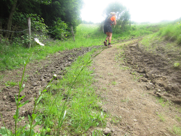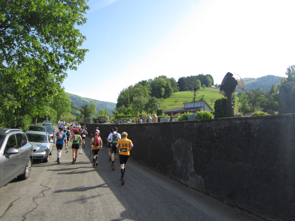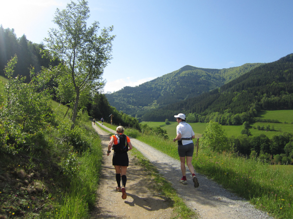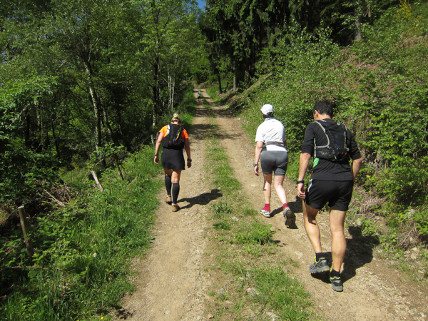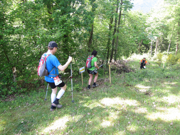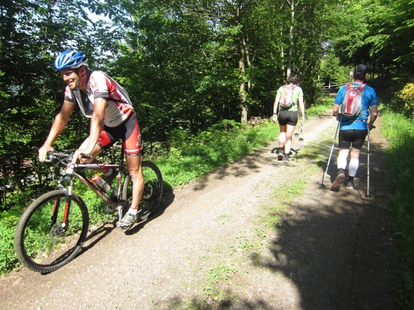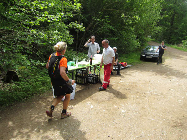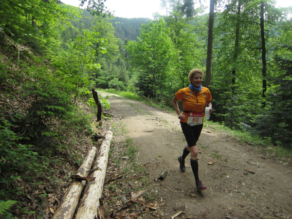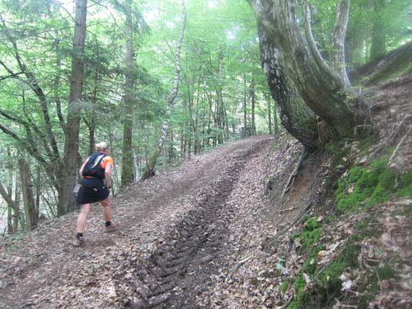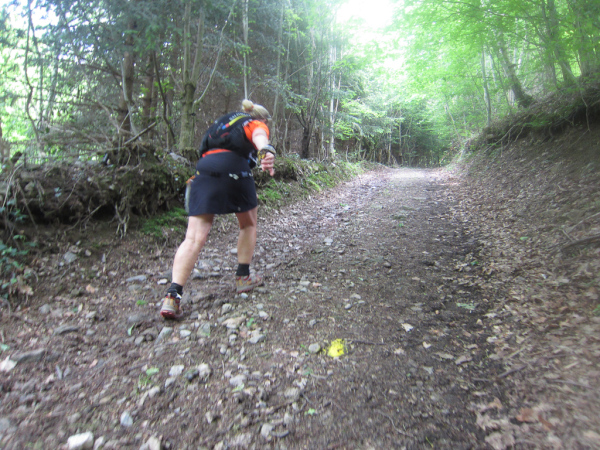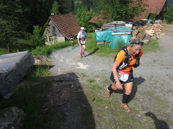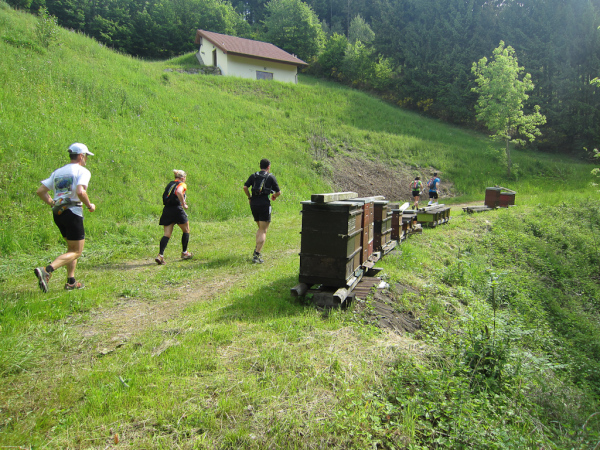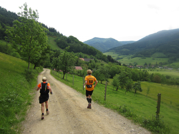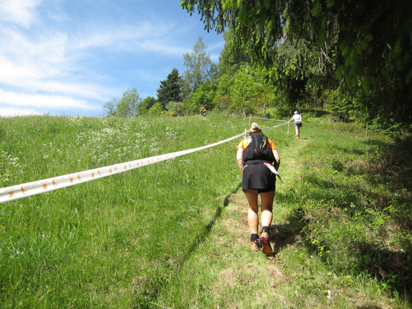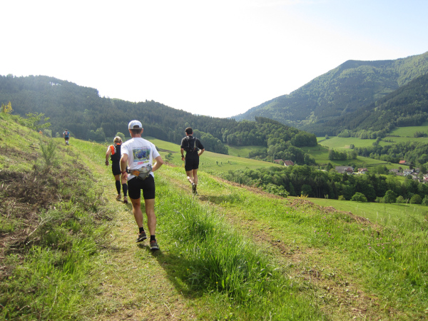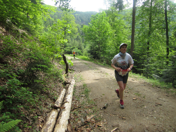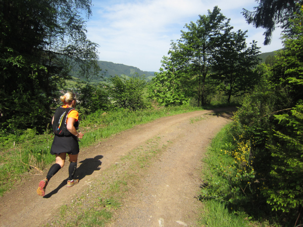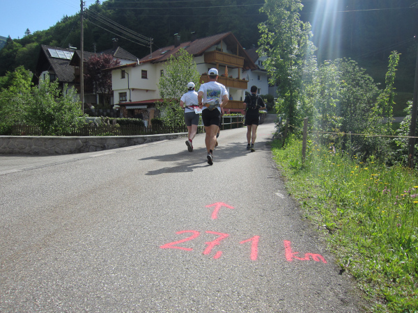 Die Spitze der Halbmarathonläufer (Panoramalauf) rast an uns vorbei. Der „Panoramatrailrun“ unterscheidet sich vom „Panoramalauf“ nicht nur durch die Kilometer, sondern auch am Geläuf der Strecke. Sofort spüren wir unter den Füßen, wann wir uns auf der identischen Streckenführung des Halbmarathons befinden bevor wir wieder in den tiefen Wald hineingeleitet werden.